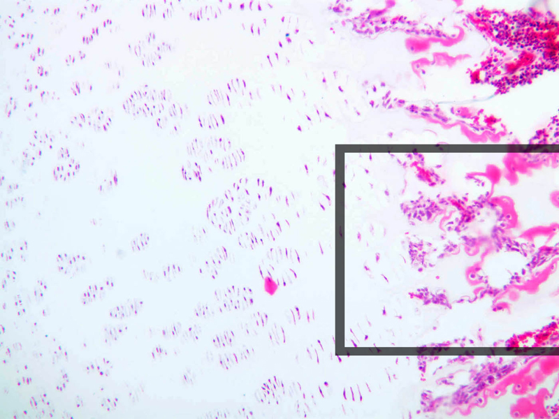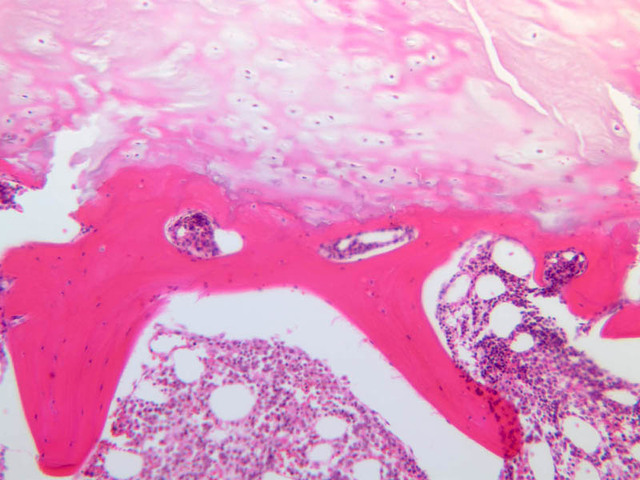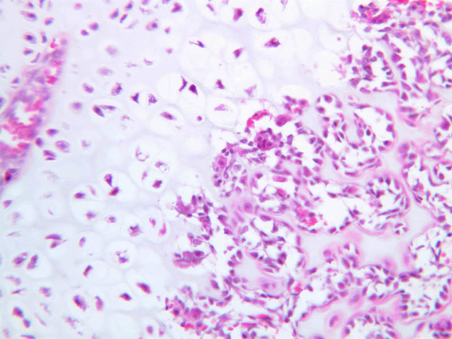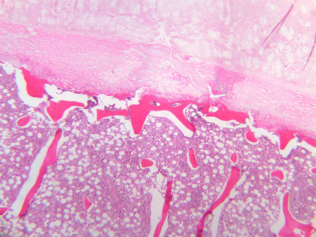 48 Hypertrophic Cartilage Cell HC H&E a9 secondary ossification 40x labeled.jpgA9, Knee Joint, 40x