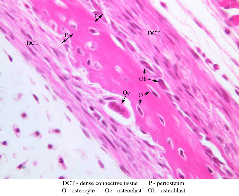 6 Dense Connective Tissue DCT H&E a15 intramembranous bone formation osteoclast fetal skull 40x labeled.jpgA15, Skull (Fetal), 40x