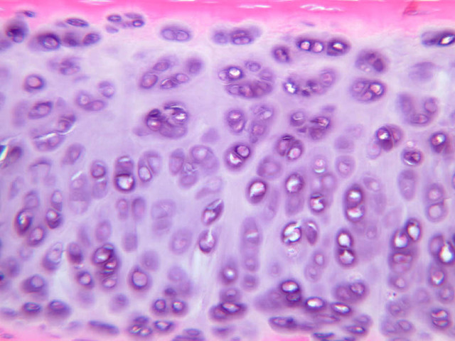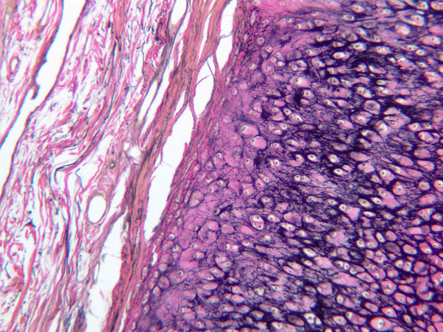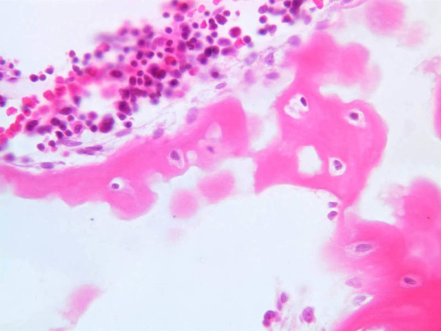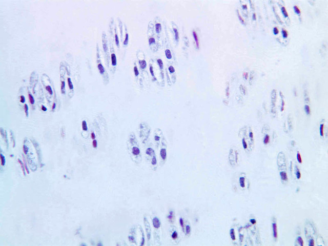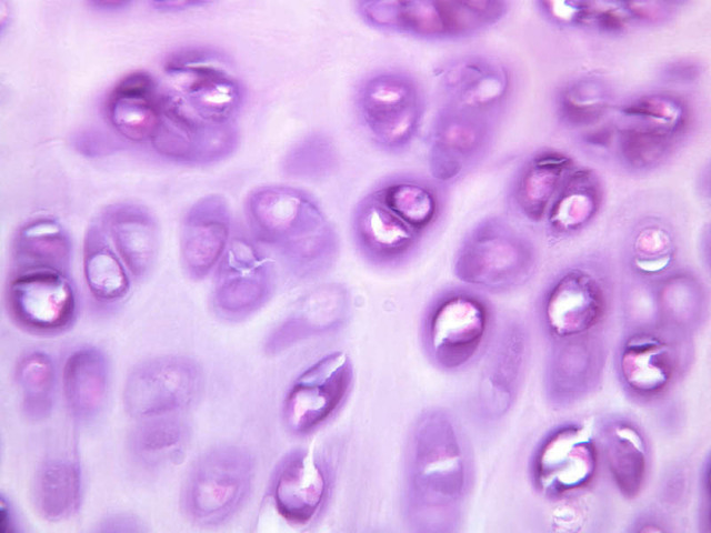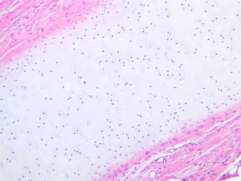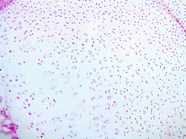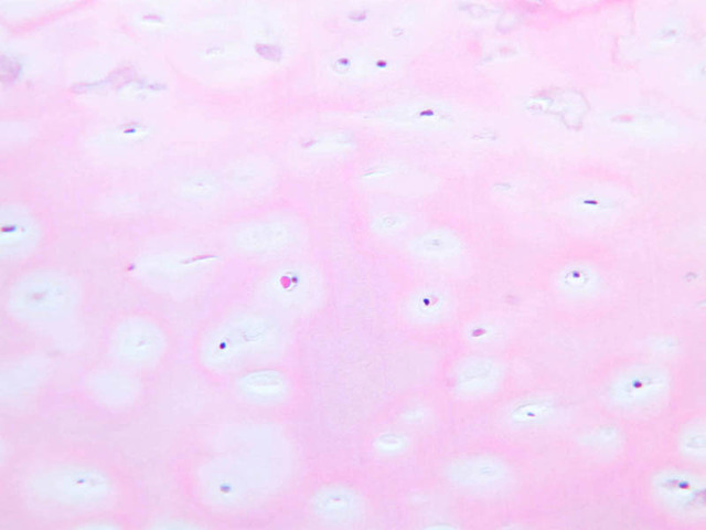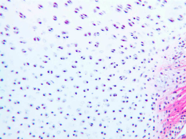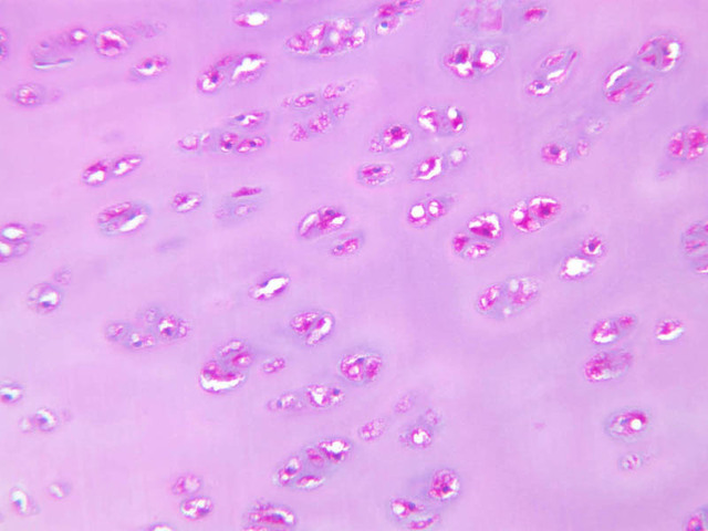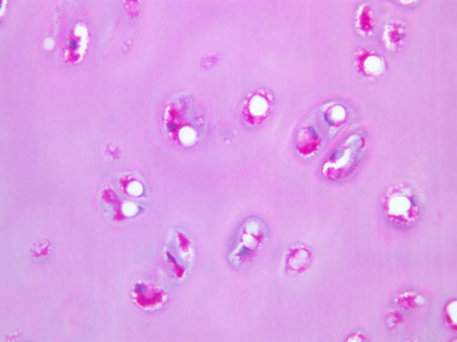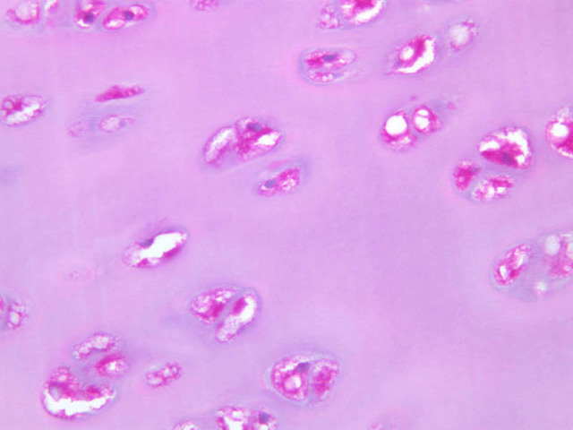 Cells inside the cartilage substance are called chondrocytes; they are enveloped by the semi-solid matrix which appears to be fibrillar. In sections the cells have usually shrunk away slightly from the matrix, exaggerating the lacuna or space in which they lie. Where several cells appear clumped together, they are called cell nests. These nests result from multiplication of chondrocytes which have thereafter been unable to move apart. Scanning the section will show that the matrix has differences in coloration from one place to another, reflecting differences in chemical constitution.