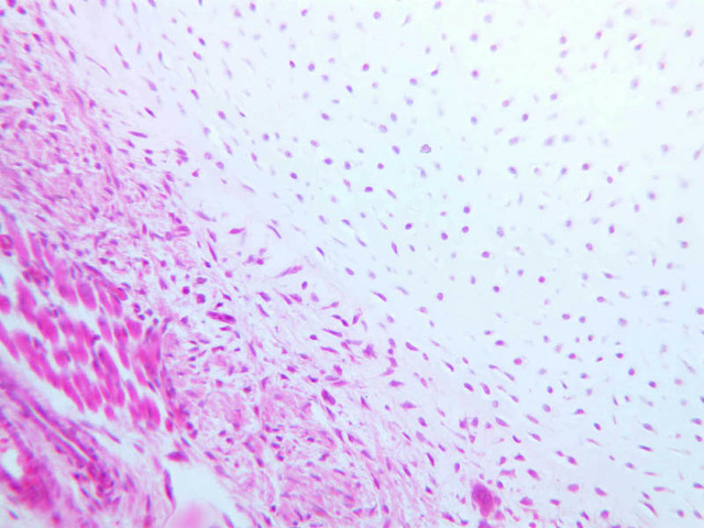 7 Fibroblast F H&E a3b fibrocartilage intervertebral disk 40x labeled.jpgA3, Intervertebral Disk, 40x