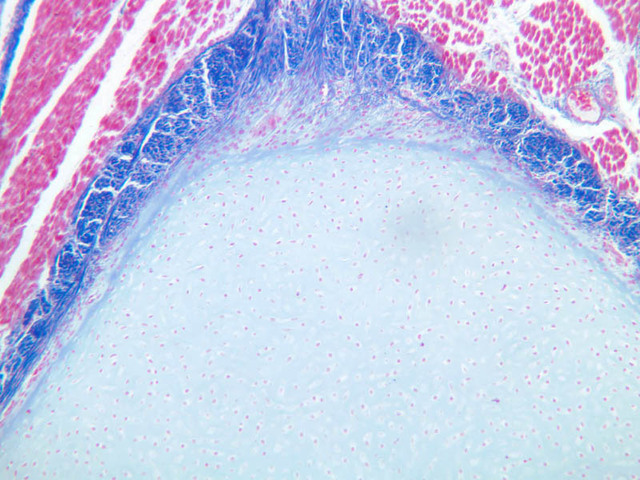Hyaline cartilage forms an incomplete ring in the wall of the trachea (slide slide A-72, PAS [2.5x, 10x-labeled, 20x, 40x-labeled] [2.5x, 10x, 20x, 40x]; A-75, H&E [2.5x, 10x, 20x-labeled, 40x] [2.5x, 10x, 20x, 40x]; A-76, H&E [2.5x, 10x, 20x, 40x] [20x, 40x]). The ring of cartilage is bound on its inner and outer sides by a dense fibro-cellular membrane called perichondrium. The perichondrium has an outer fibrous and inner chondrogenic (cellular) layer. These layers are discernable when cartilage is actively growing (A-6, infant costal cartilage, H&E [2.5x, 10x, 20x, 40x-labeled] [2.5x, 10x, 20x, 40x]; A-6, aniline blue [2.5x, 10x, 20x, 40x]). Cartilage grows when cells (chondroblasts) within this membrane deposit new ground substance. The perichondrium is also the means by which ligaments and tendons are attached to the cartilage.