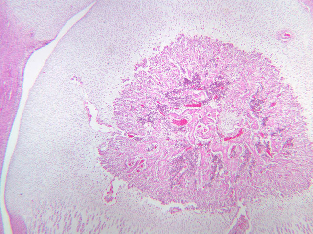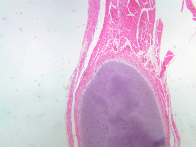 Also note that the cartilaginous end of the femur has a secondary center of ossification in the middle of the cartilage. This proceeds by ingrowth of blood vessels into the cartilage, bringing osteoblasts. Try to identify the blood vessels, new bone, and bone marrow within the center of the cartilage. In humans, this secondary center of ossification appears at the end of bones at various ages; in the proximal femoral head it is present near the time of birth and continues to ossify throughout childhood. The secondary center of ossification of the distal femoral condyle (which is on slide A-9) appears somewhat later after birth.