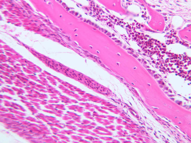 7 Periosteum P H&E a15 intramembranous bone formation osteoclast fetal skull 40x labeled.jpgA15, Skull (Fetal), 40x