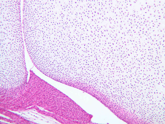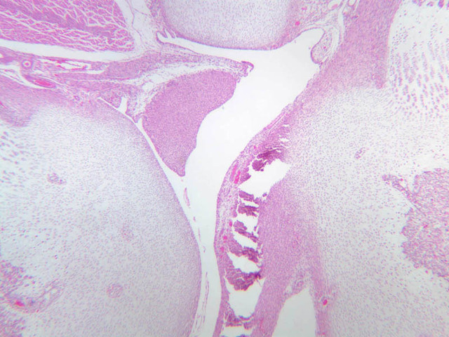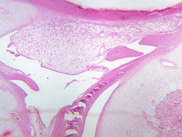 35 Periosteum P H&E a15 intramembranous bone formation osteoclast fetal skull 40x labeled.jpgA15, Skull (Fetal), 40x; a9 growth plate knee joint 2x labeled.jpgA9, Knee Joint, 2.5x