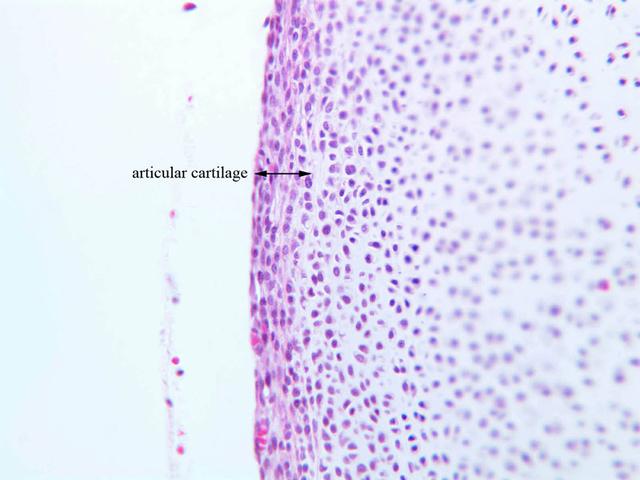 1 Joint Cavity JC H&E a9 articular cartilage knee joint 2x labeled.jpgA9, Knee Joint, 2.5x