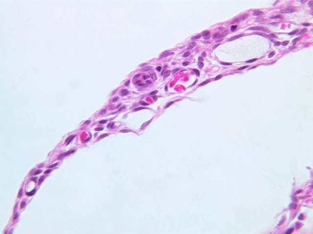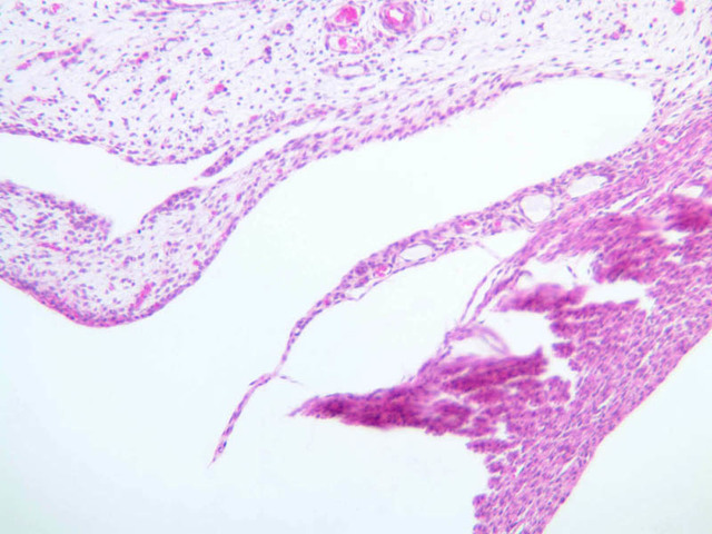 The joint space is defined by fibrous ligaments forming a dense capsule, and is lined by synovium, present as delicate vascular tissue which extends along the surface of the articular cartilage in a papillary fashion (slide A-9 [1x] [2.5x, 10x, 20x, 40x] [2.5x-labeled, 10x, 20x, 40x]). The synovium is lined by two kinds of cells – secretory and phagocytic, although these are not easily distinguished from one another. You should be able to identify the synovium within the joint space, and see the lining, which covers the loose fibrous-vascular network underneath. The synovium is important in producing synovial fluid, which lubricates the joint; synovial fluid also nourishes the cartilage, which in adults is completely avascular. The knee joint is a complicated joint, which allows movement in several planes. In addition to the fibrous capsule, there are additional ligaments between the bones, adding to flexibility and stability of the structure as a whole.