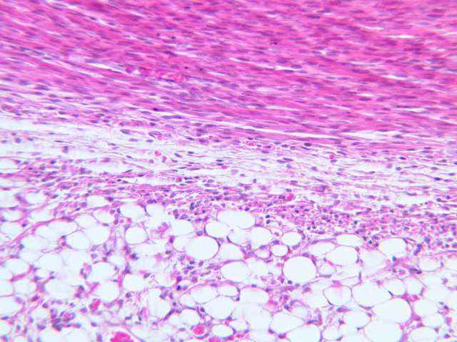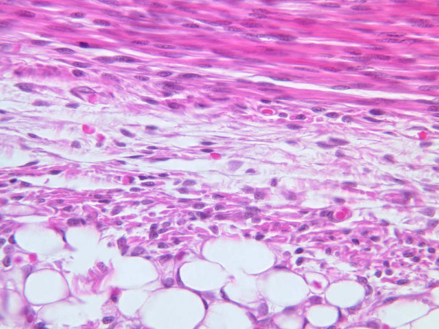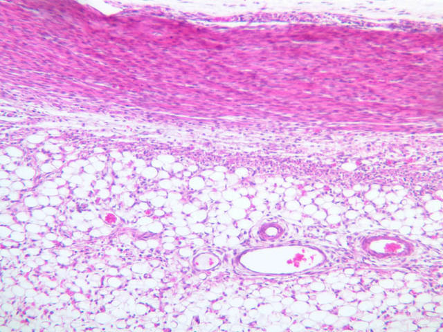 2 Synovium (none) H&E a9b synovium and joint capsule knee 2x labeled.jpgA9, Knee Joint, 2.5x