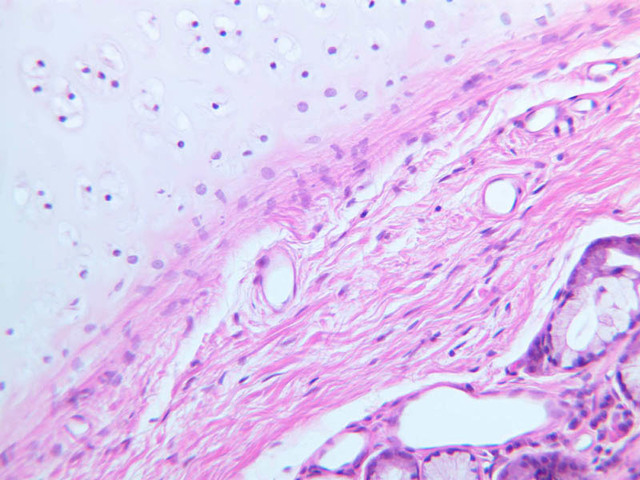 14 Fibrous Perichondrium Pf H&E a6 costal cartilage 40x he labeled.jpgA6, Costal Cartilage, 40x