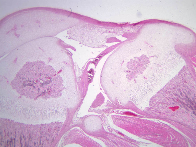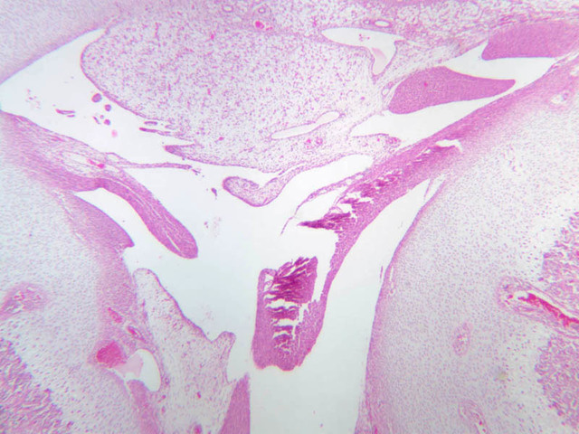 3 Brain (none) H&E a15b intramembranous bone formation fetal skull 2x labeled.jpgA15, Skull (Fetal), 2.5x