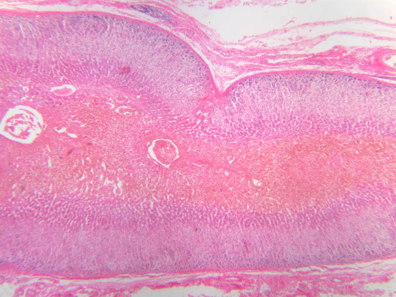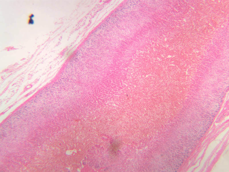 was the specimen on slide B-61), brownish precipitates form in the cells of the medulla--