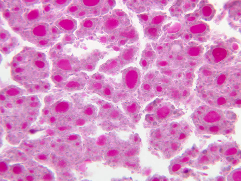 of colloid-filled cysts. In H&E-stained sections, the adenohypophysis is darker than the