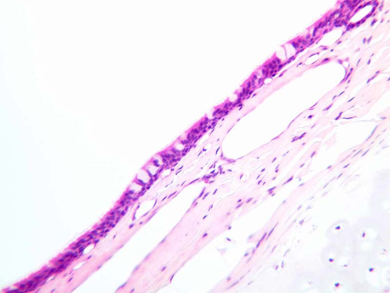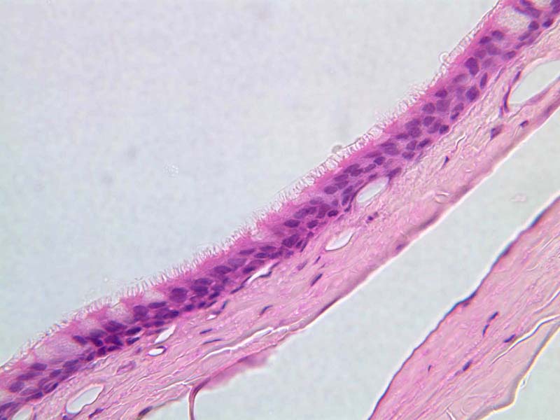 Pseudostratified epithelium. One large category of lining tissue remains. Look at a section of trachea (slide A-75 [20x, 40x] [20x, 40x] [40x, 40x, 40x-labeled]; A-76 [10x, 20x, 40x]) and observe its inner lining of epithelial cells. The shape of their nuclei suggests columnar cells, and there appears to be more than one layer of nuclei, suggesting that the cells are stratified. However, by maceration, it can be shown that each cell in the epithelium is attached to the underlying basement membrane. Unlike a true simple (single-layered) epithelium, on the other hand, not all of the cells reach the surface (i.e., basal cells). Since it is neither truly a simple nor a stratified membrane, this epithelium is called pseudostratified columnar.