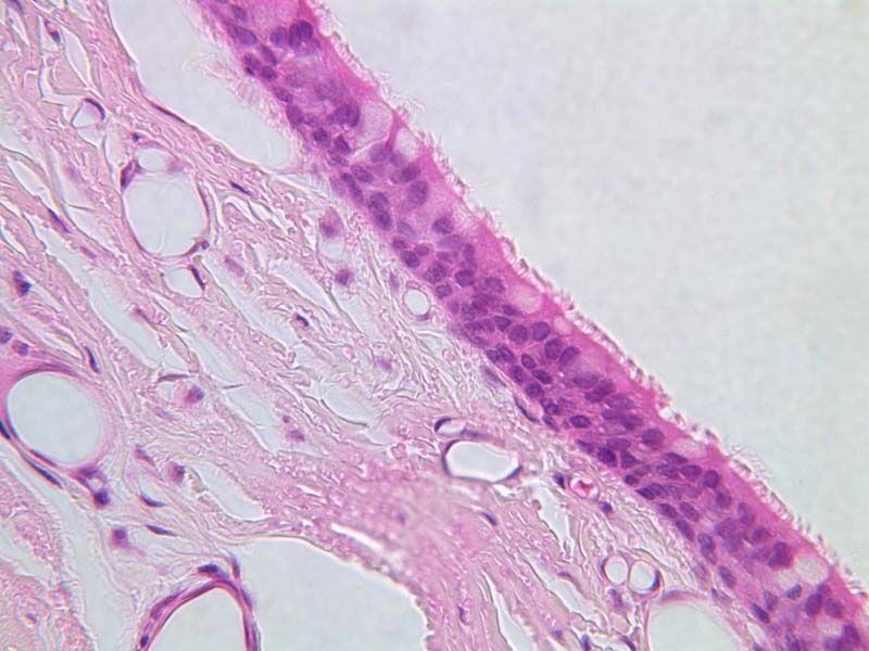 Stratified epithelium. The study of stratified epithelium may be started by looking at a cross-section of the stratified squamous epithelium of the esophagus (slide B-2 [20x, 40x] [10x, 20x, 40x] [2.5x, 10x, 20x, 40x]). Make a low power examination of the band of tissue forming its inner lining. The most noticeable feature of this tissue band is its basophilic nuclei. Observe their distribution in numerous layers. Nuclear shapes reflect the shapes of individual cells in the epithelium. By studying these epithelial cells with the high power objective, look for boundaries between cells. If they are not apparent, an imaginary line drawn midway between neighboring nuclei will mark their approximate location.