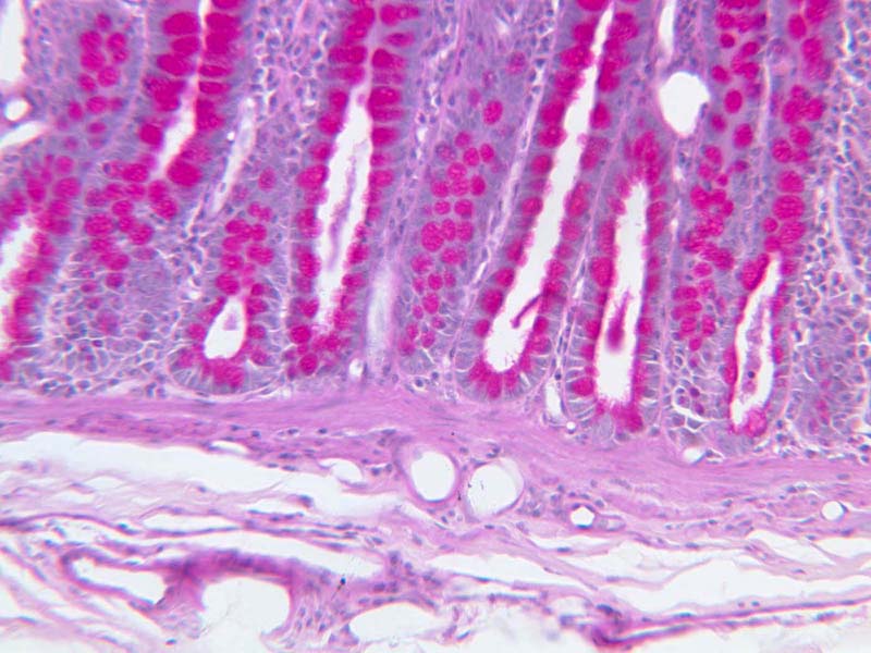 3 Goblet Cell GC PAS b25b goblet cells colon 40x pas labeled.jpgB25, Colon (Goblet Cells), 40x