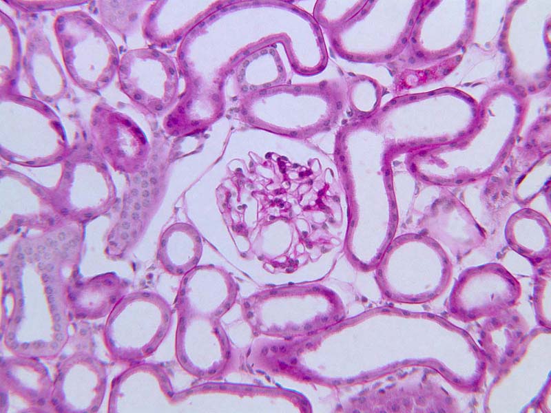 This type of one-layered epithelium serves as a filter in many places in the body. It is composed of very thin sheets of flattened, polyhedral (squamous) cells and thus is called simple squamous epithelium. Look for cells arranged in a single layer surrounding a glomerulus in the kidney. Within the cortex (the outer, or peripheral zone of the kidney) identify capillary tufts called glomeruli located within a circular structure (slide B-68, kidney, H&E [10x, 20x, 40x-labeled]). The lining of the circular structure (called Bowman's capsule) is simple squamous epithelium. You may only appreciate the flattened nuclei of these cells. The epithelium, cut perpendicular to its plane of spread, is visible as a chain of nuclei connected by very thin lines of cytoplasm. This attenuated sheet of cells with their semipermeable membranes offers a minimum barrier to the passage of many substances, but completely halts others: hence its efficacy as a living filter.