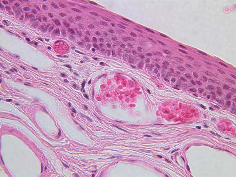 Compare the appearance of this stratified squamous epithelium with that which lines the esophagus. The stratification of these epithelia gives some protection to underlying tissues against physical abrasion; it reflects the continuing regeneration of their surface scales in the skin; it prevents desiccation and may provide insulation against heat loss from closely subjacent blood vessels; and in the esophagus, it provides a moist, lubricated layer to aid in food passage. Stratified squamous epithelium can thus exist in a keratinized or non-keratinized form as the local conditions demand. Compare the structure of the stratified squamous epithelium on either side of the lip (slide A-55- internal [2.5x, 10x, 20x]; A-55-external [2.5x, 10x, 20x, 40x]).