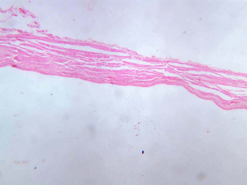 Look for a similar connected chain of nuclei lining the inside of a large vein (see slide A-28, renal artery and vein, H&E [2.5x-labeled, 10x, 20x, 40x-labeled]; AF [10x, 20x, 40x]), or in capillaries (slide A-28, connective tissue, H&E [2.5x-labeled, 10x, 20x, 40x-labeled] [20x, 40x, 40x, 40x]; AF [10x, 20x, 40x]). The inner lining of the blood vessels, called the endothelium is a simple squamous epithelium. The lining may appear interrupted in the section, in part because the cytoplasm between nuclei is drawn out so thinly. In life, of course, the membrane is unbroken and lines the vessel completely. The simple squamous epithelium that lines the abdominal cavity has the special name of mesothelium.