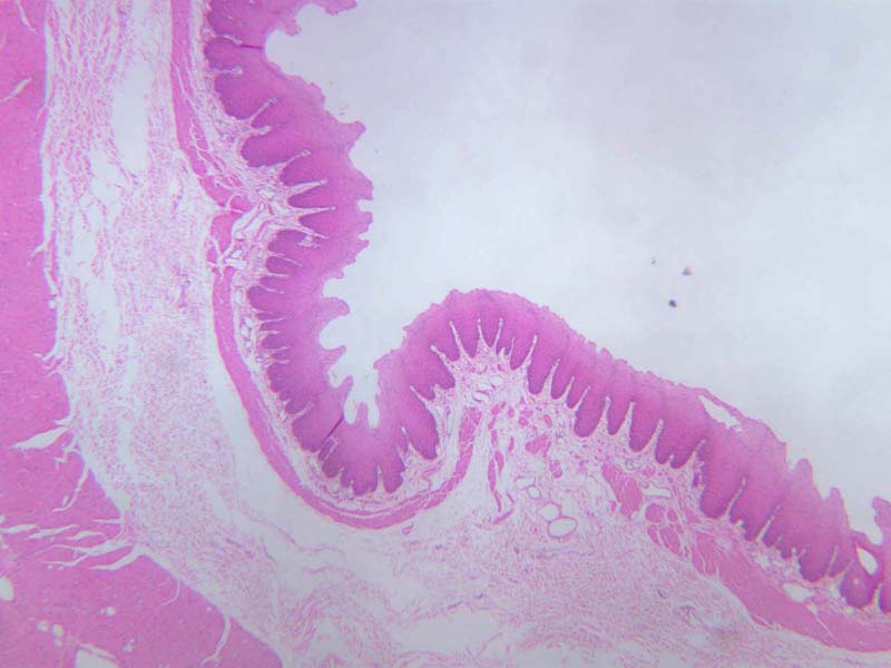 Stratified epithelium. The study of stratified epithelium may be started by looking at a cross-section of the stratified squamous epithelium of the esophagus (slide B-2 [20x, 40x] [10x, 20x, 40x] [2.5x, 10x, 20x, 40x]). Make a low power examination of the band of tissue forming its inner lining. The most noticeable feature of this tissue band is its basophilic nuclei. Observe their distribution in numerous layers. Nuclear shapes reflect the shapes of individual cells in the epithelium. By studying these epithelial cells with the high power objective, look for boundaries between cells. If they are not apparent, an imaginary line drawn midway between neighboring nuclei will mark their approximate location.