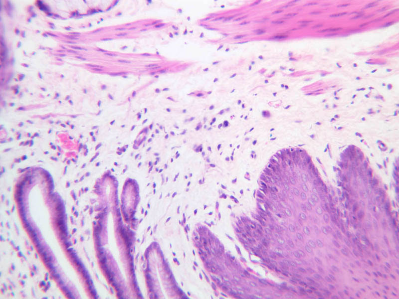 40x]). As you examine the epithelial surface of this section, you should be able to find a region of rather abrupt transition from the stratified squamous epithelium typical of the esophagus to the simple columnar epithelium of the gastric cardia. There may be a narrow zone of stratified cuboidal or stratified columnar epithelium between the definitive epithelia of esophagus and stomach.
