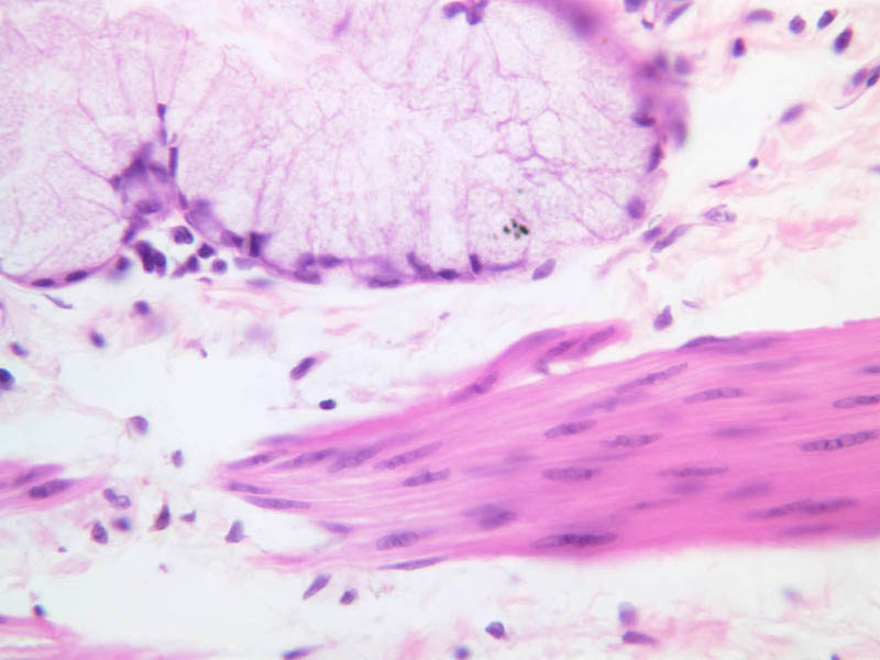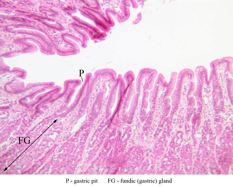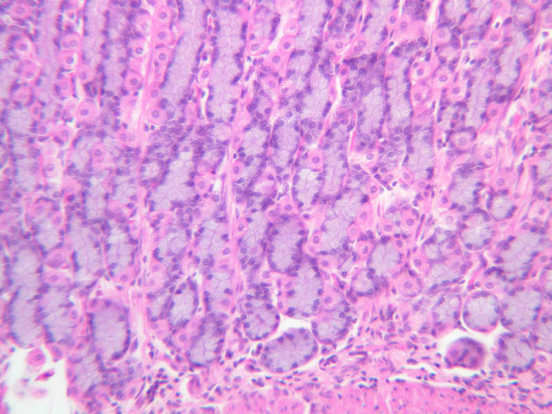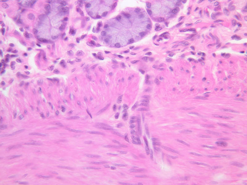 40x]) they stand out dramatically by virtue of their magenta-colored secretory product. As a rule, several glands extend from each gastric pit to the muscularis mucosae, largely obscuring the lamina propria. Small slips of smooth muscle that extend from the muscularis mucosae towards the luminal surface are presumed to be involved in expressing the glandular secretions.