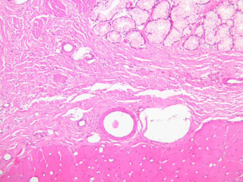10x]). By studying these sections, you will be able to familiarize yourself with the basic structural plan of the entire digestive tube. Find the esophageal lumen and identify the three components of the mucosa (mucous membrane): a stratified squamous (nonkeratinized) epithelium, a layer of loose connective tissue (lamina propria) and a thin double layer (inner circular/outer longitudinal) of smooth muscle, known as the muscularis mucosae. The submucosa, which consists largely of dense irregular connective tissue, lies beneath the mucosa. Carefully scan the submucosa to find ganglion cells and bundles of nerve fibers that comprise Meissner's plexus (submucosal plexus). You may also find mucous glands (esophageal glands proper) in the submucosa. The muscularis externa lies beneath the submucosa. In the esophagus, the muscularis externa consists of an inner circular and an outer longitudinal layer of muscle. Note that at the mid-esophageal levels represented by these slides, the muscularis externa consists of a mixture of smooth and skeletal muscle. What kind of muscle would you expect to find in the upper esophagus? In the lower esophagus? Between the two layers of the muscularis externa you should be able to find ganglion cells and nerve fibers of Auerbach's plexus (myenteric plexus). External to the muscularis externa is a layer of connective tissue, the tunica adventitia, which binds the esophagus to surrounding structures.