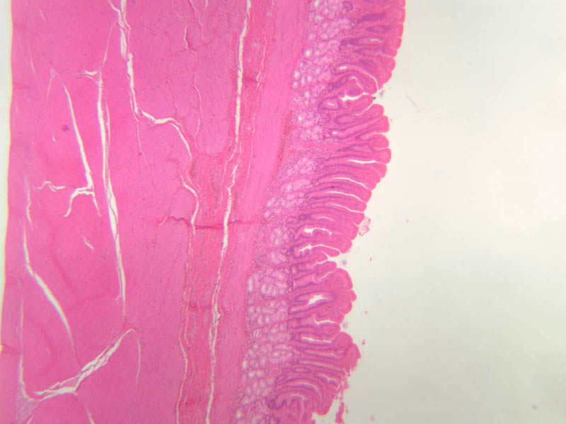 10x]). The mucosa appears as a basophilic band that is about 1.5 mm thick. The external muscular layer appears as a 2-3 mm thick band that runs a fairly straight course along the length of the section. The submucosa, which is sandwiched between the mucosa and muscularis externa, is usually thinner and more lightly stained than either of the other two layers. Since these sections were taken from a relaxed stomach, the luminal surface is thrown into large folds (rugae), which appear to consist of a fingers of submucosal connective tissue and their overlying mucosa. Rugae are transient adaptations to the cyclical filling and emptying of the stomach: as the stomach fills with ingested food the rugae are stretched out of existence, only to reappear as the stomach flushes its contents into the duodenum.