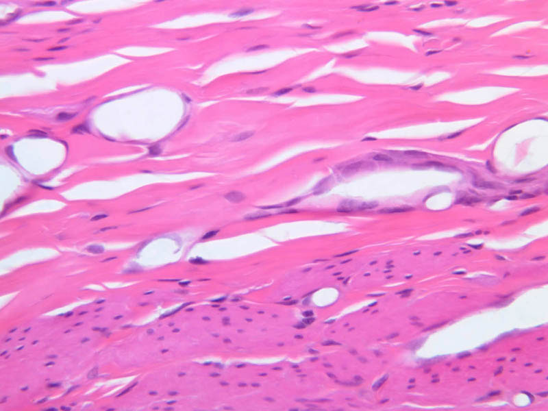 lacteal (because of its milky appearance after a fatty meal). Note its thin endothelial wall and its irregular lumen, common features of lymphatic