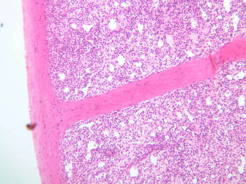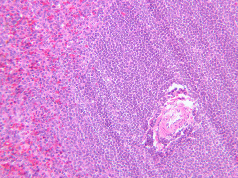 Now look at the medullary region where lymphocytes are sparser (A-44, H&E