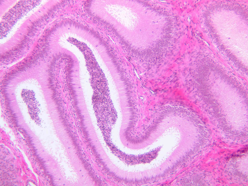 surrounded by an epithelial wall of uniform thickness). Observe that the peripheral