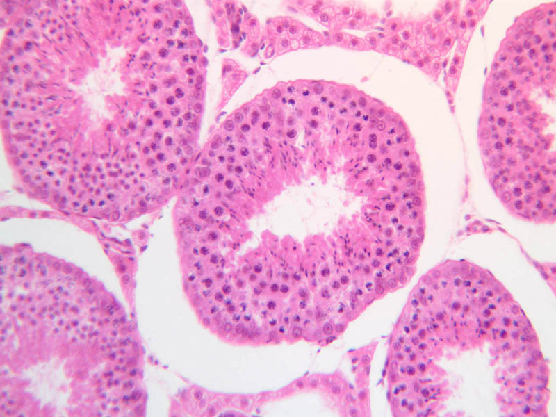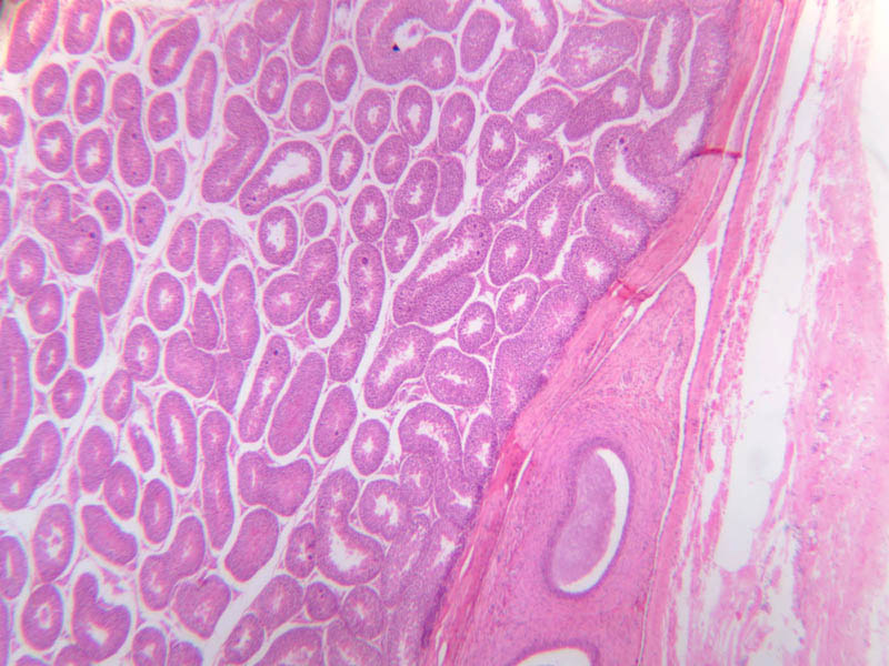 Scan a section of testis from the slide boxes at low magnification, and note the