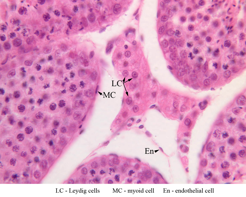 is accomplished by Leydig cells. Leydig cells are often arranged in clusters with their