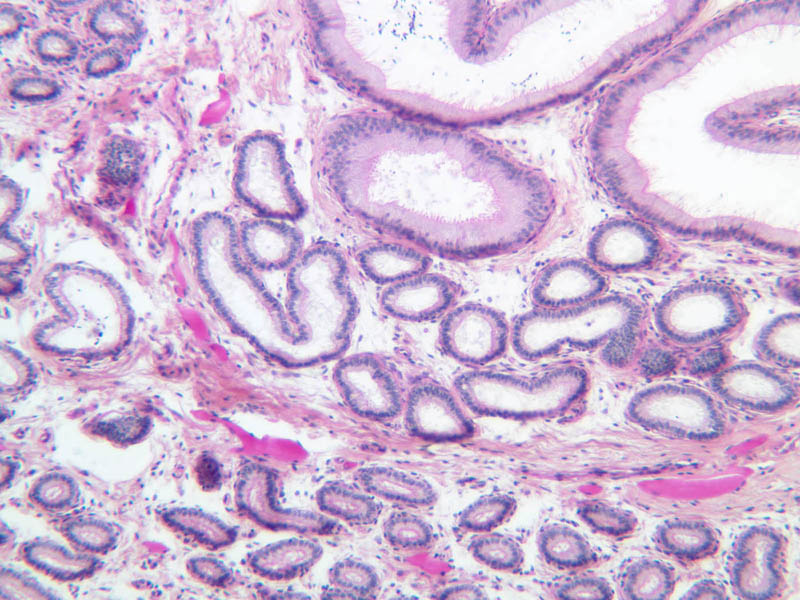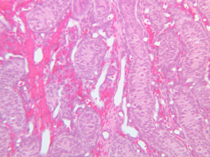 Observe the interstices at high magnification in slide B-80 (H&E [