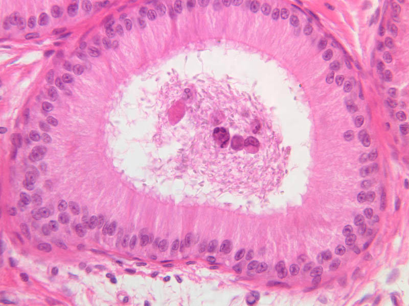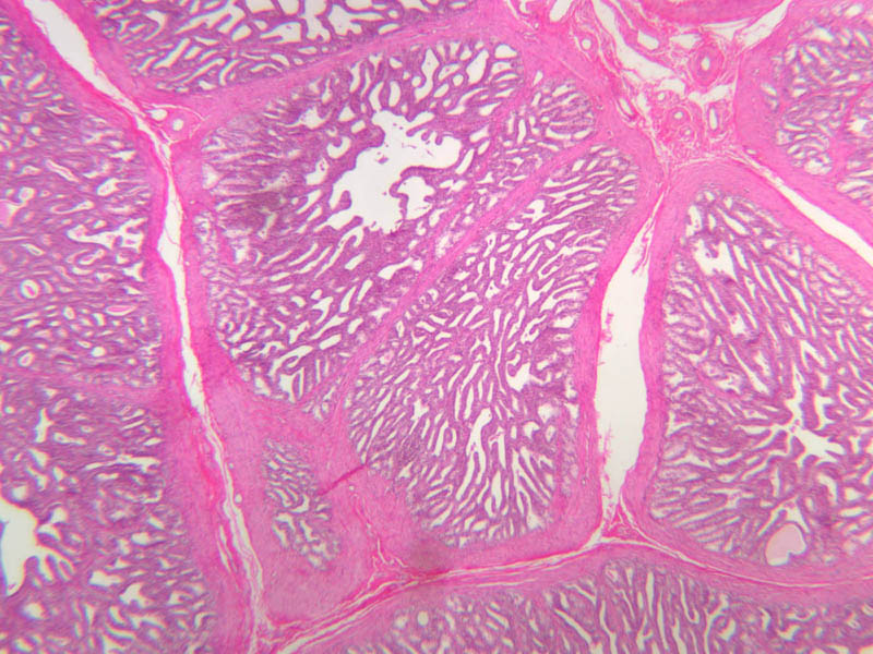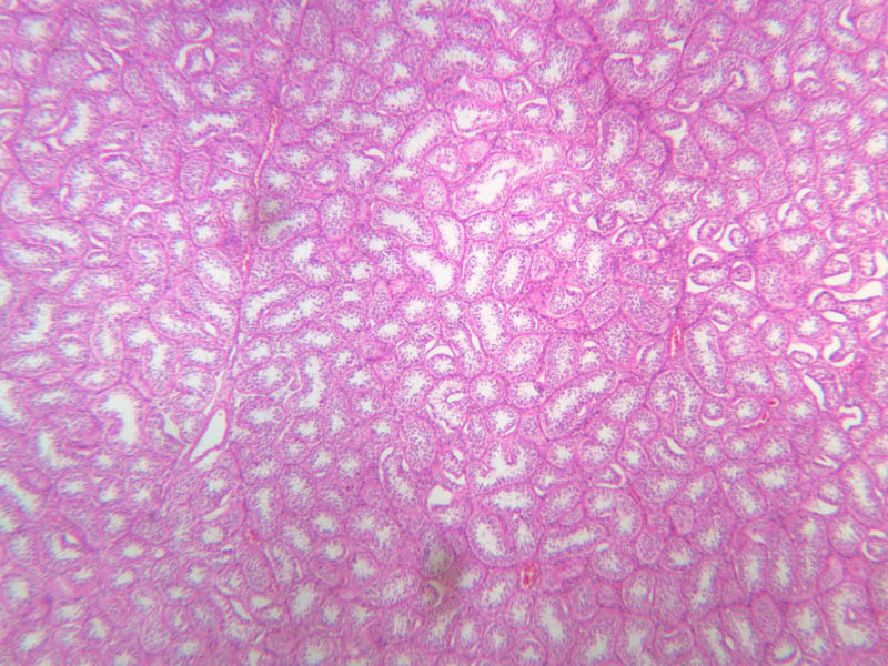 Scan a section of testis from the slide boxes at low magnification, and note the
