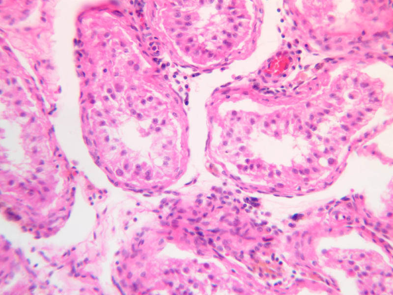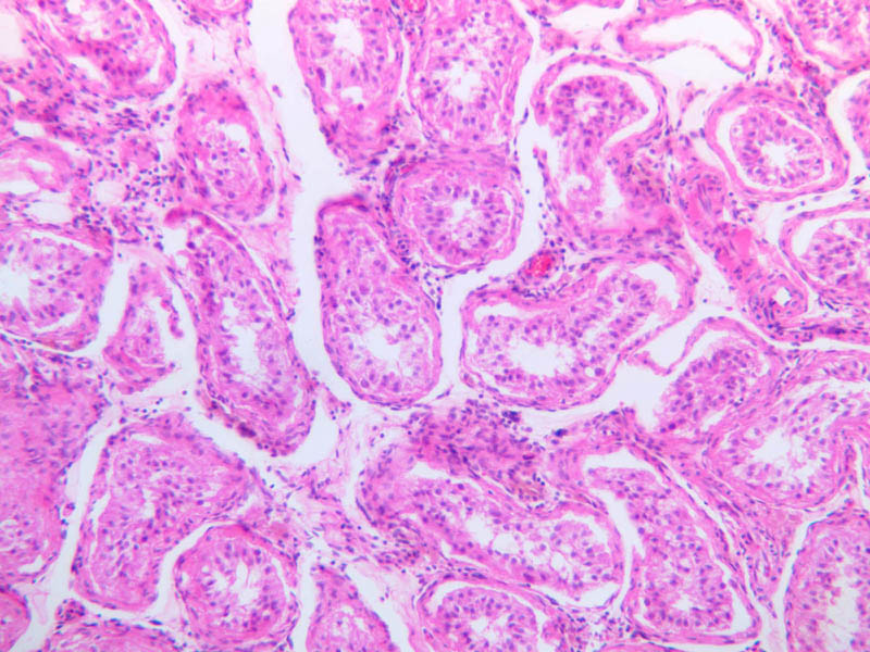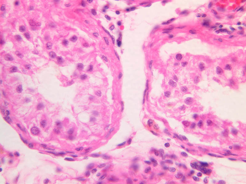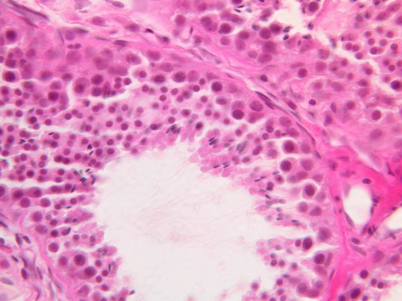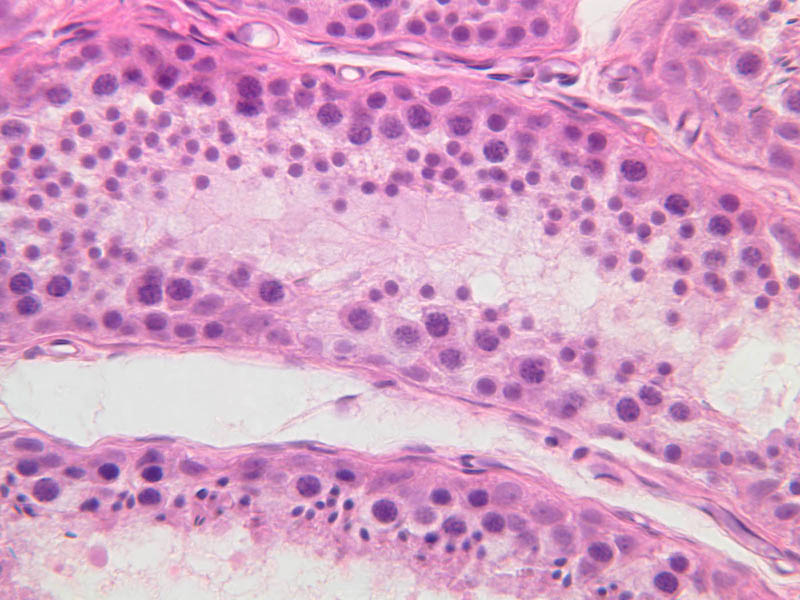 The clearly stratified seminiferous epithelium differs in appearance from one