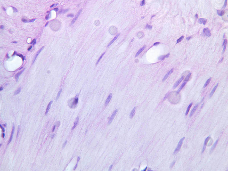 40x]). These specialized muscle cells will have a larger diameter than cardiac myocytes and they have lightly stained, eosinophilic cytoplasm. The central area of each cell appears especially light due the presence of glycogen.