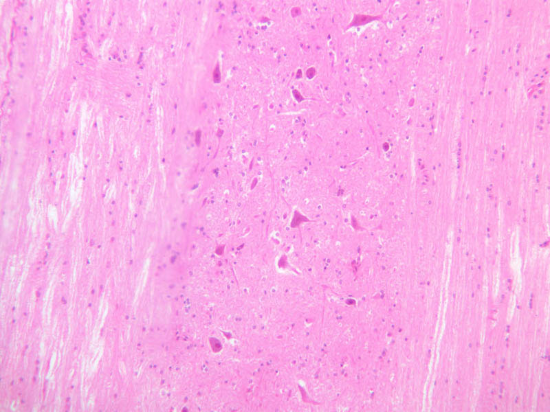 grey matter contains numerous large neurons and the eosinophilic ground substance is the