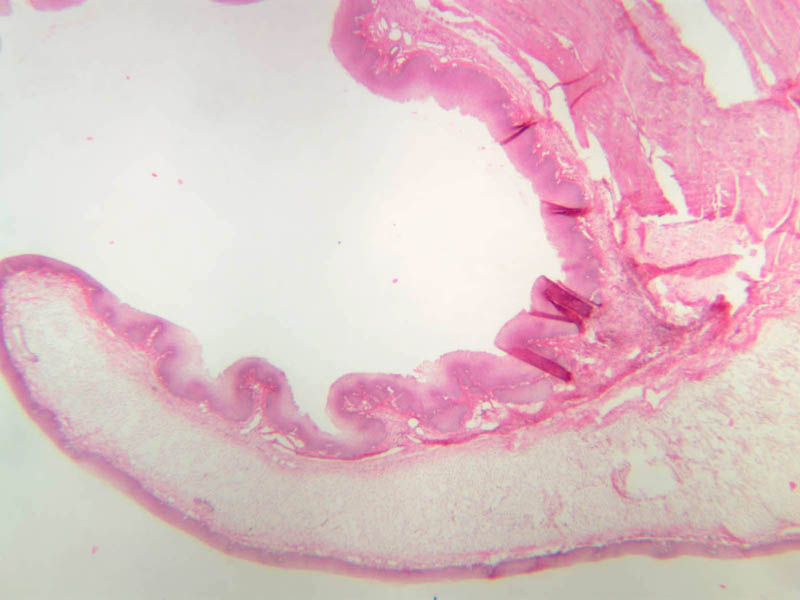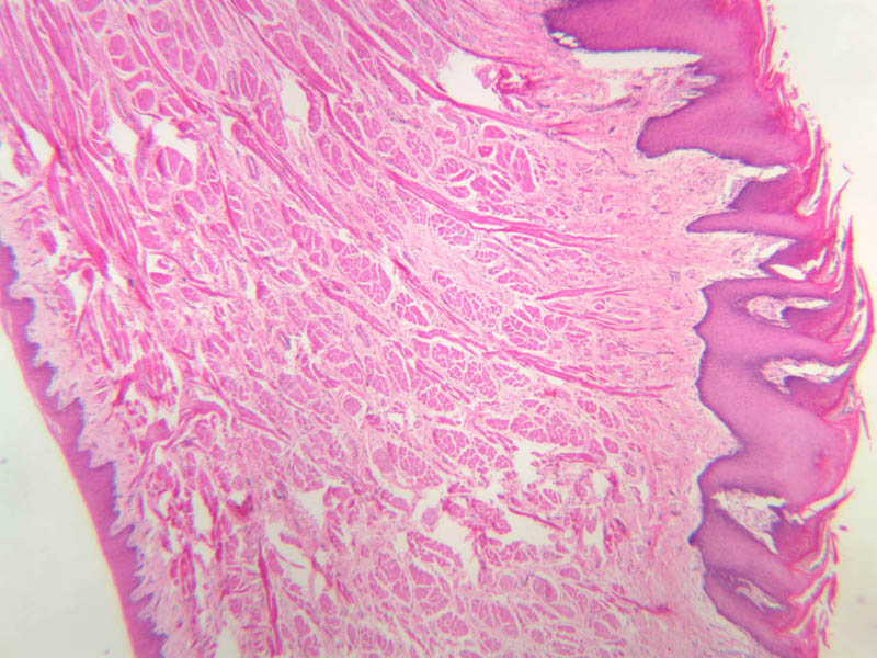 Using the section on slide A-64 [2.5x-labeled, 10x, 20x, 40x-labeled], examine the muscular core of the tongue and compare the mucosae of the dorsal and ventral surfaces. You should be able to find good examples of filiform papillae, which, as a rule, are the only parts of the tongue's surface that bear keratinized epithelium (A-63 [2.5x, 10x-labeled, 20x, 40x], [2.5x, 10x, 20x, 40x]. How does the epithelium of the inferior surface of the tongue differ from that of the superior surface? Your slide collection also has examples of fungiform (A-63 [2.5x-labeled, 10x-labeled, 20x, 40x] and foliate (A-63 [2.5x, 10x, 20x, 40x] papillae.