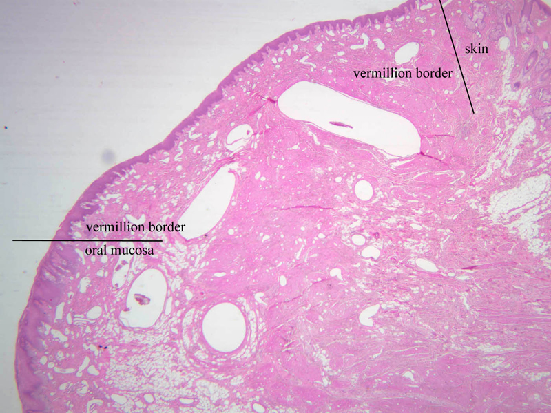 1 Vermillion Border (none) H&E a55 lip transition 1x labeled.jpgA55, Lip, 1x