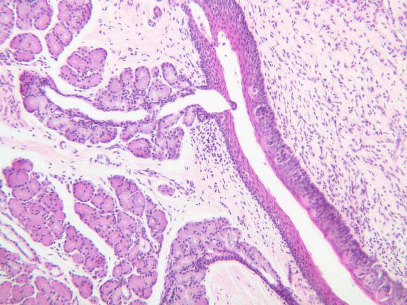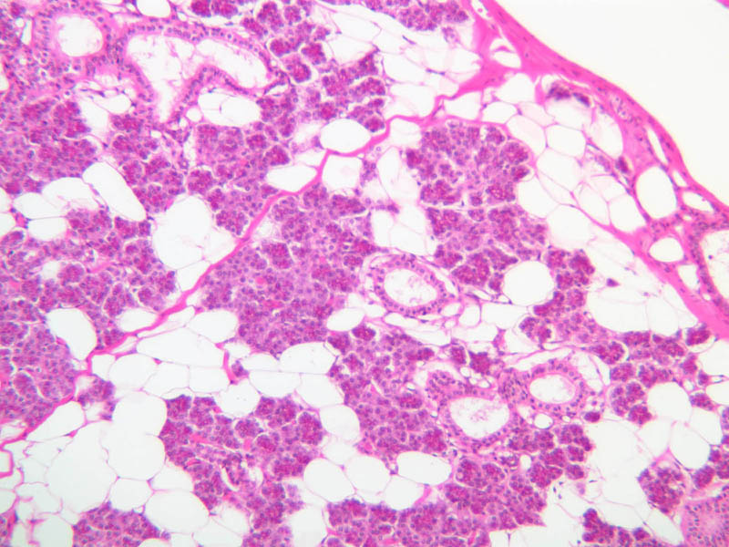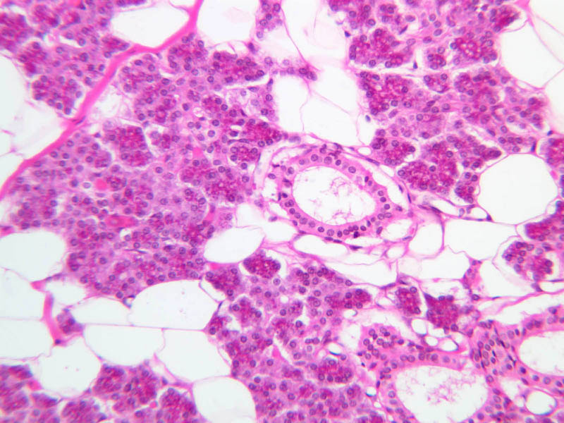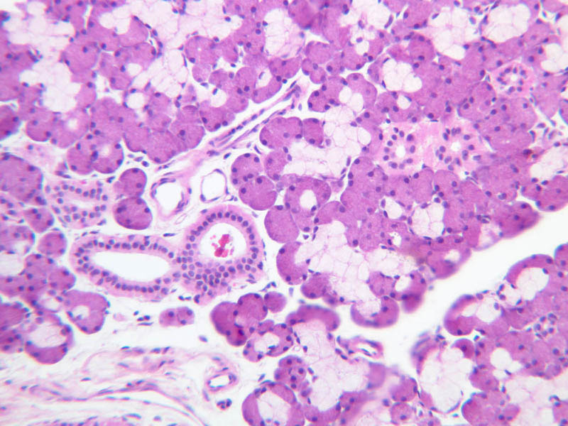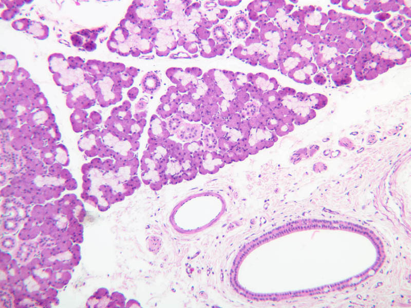 18 Duct (gland) (none) H&E b43 submandibular gland mix 10x he labeled.jpgB43, Submandibular Gland, 10x