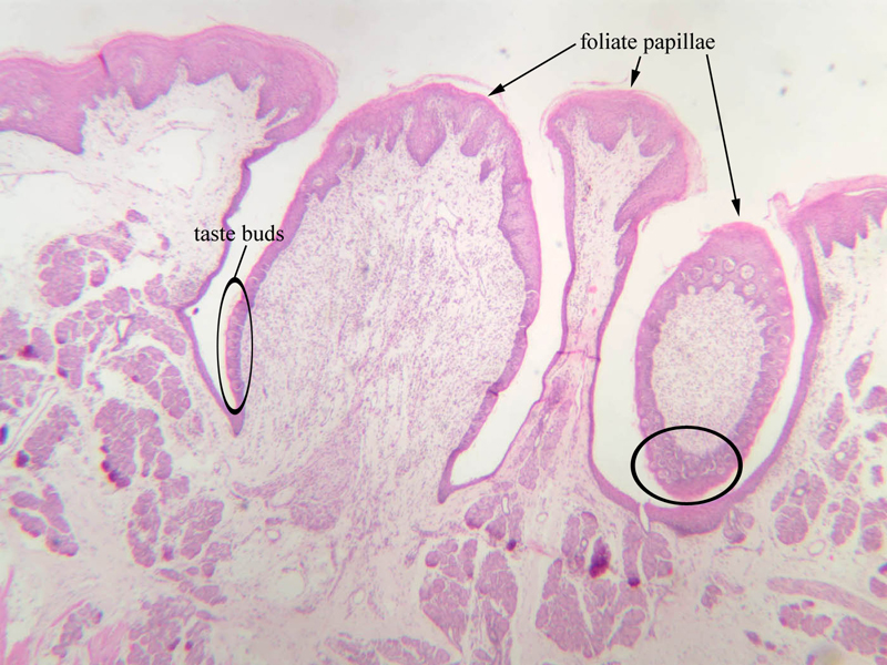 17 Foliate Papillae (none) H&E a63b taste buds tongue 2x labeled.jpgA63, Tongue, 2.5x