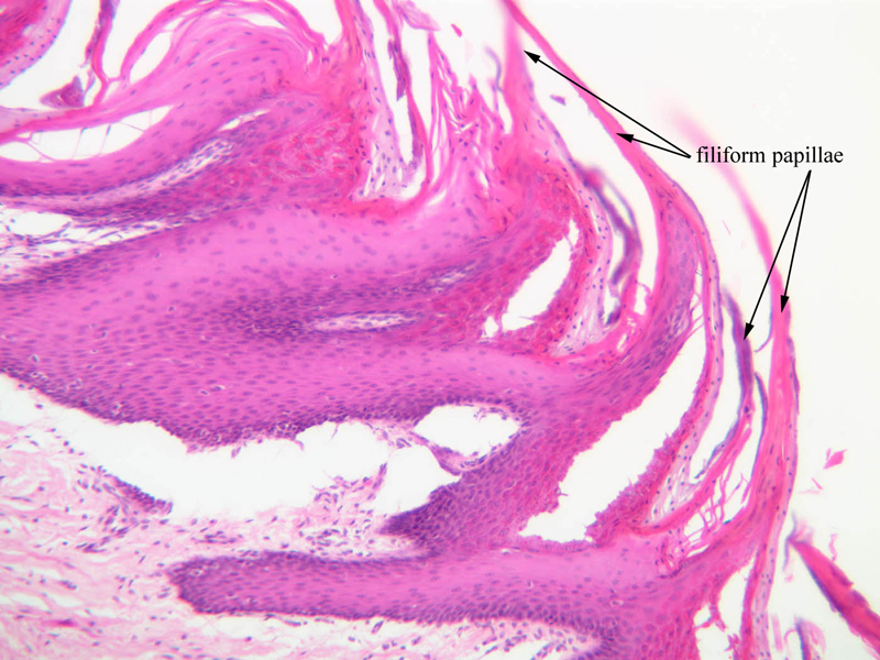 10 Filiform Papillae (none) H&E a64b filliform papillae tongue 10x labeled.jpgA64, Tongue, 10x