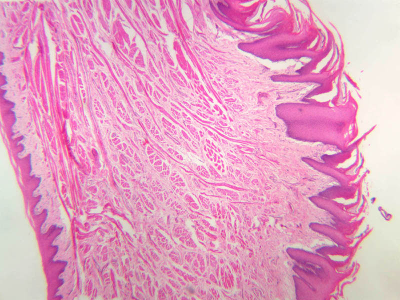 Using the lowest power objective, scan the section of human lip on slide A-55 [1x-labeled, 2x-labeled, 10x-labeled, 20x, 40x]. Note that the oral surface of the lip is covered by a very thick stratified squamous epithelium. Over the vermilion border (in life, the reddish portion) of the lip the stratified squamous epithelium is thinner and its outer layers are keratinized. This stratified squamous keratinized epithelium continues onto the outer surface of the lip, where sweat glands and hair follicles with their associated sebaceous glands appear in the underlying connective tissue bed. Note the abrupt change in epithelial thickness at the junction between the vermillion border and the oral mucosa; note also that this change in epithelial thickness pretty much coincides with a transition from keratinized to parakeratinized to nonkeratinized superficial layers. Look at your own lip and try to correlate what you see in the slide with what you see in the mirror.