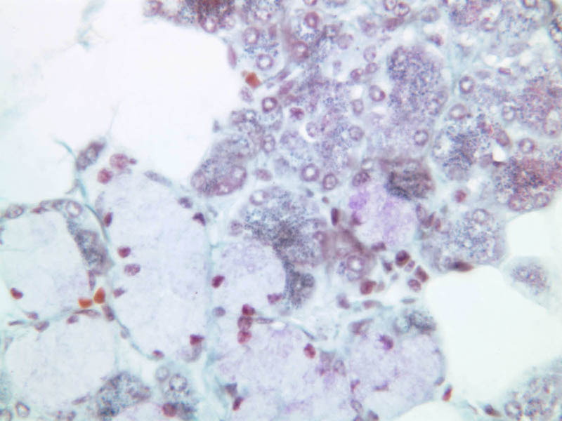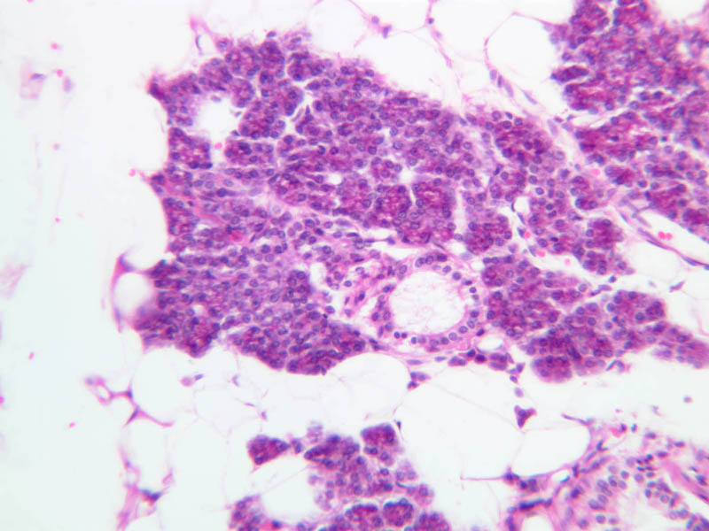 19 Adipocytes (none), A H&E, PAS b43 submandibular gland mix 10x he labeled.jpgB43, Submandibular Gland, 10x; b43 submandibular gland mix 40x pas labeled.jpgB43, Submandibular Gland, 40x