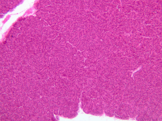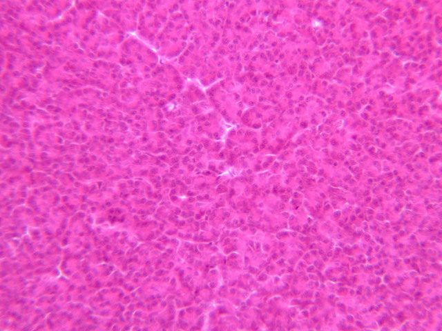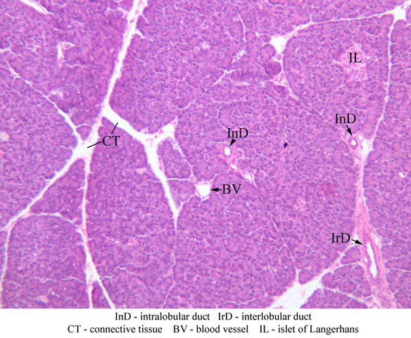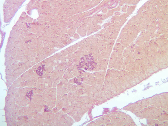 Scan slide B-36 (H&E [10x, 20x] [10x, 20x). Note that in this H&E preparation most of the pancreas consists of rather compactly arranged, darkly stained cells. The compact, darkly stained regions constitute the exocrine portion of the pancreas. (Of what organ does the exocrine pancreas remind you?) The endocrine portions of the pancreas consist of small bits, or islands, of more lightly stained tissue that is somewhat irregularly dispersed within the substance of the exocrine pancreas. Drawing on the name of their discoverer, the endocrine portions of the pancreas are known as the islets of Langerhans.