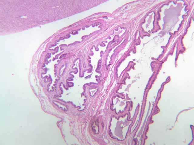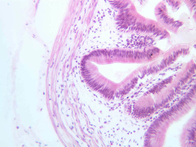 Sections through the wall of the gall bladder appear on slide B-33 (H&E [2.5x, 10x, 20x-labeled, 40x-labeled] [2.5x, 10x, 20x, 40x]). As you examine the epithelium, try to identify the striated border, which functions in absorbing water from the bile. Look for lymphocytes, capillaries and small mucous glands in the lamina propria; lymphocytes often appear to invade the epithelium itself. The gallbladder does not have a discernible submucosa; rather, a muscularis layer, consisting of smooth muscle and connective tissue underlies the mucosa. Some sections may permit identification of both a tunica adventitia, which binds the gallbladder to the liver, and a tunica serosa where the gallbladder faces the peritoneal cavity.