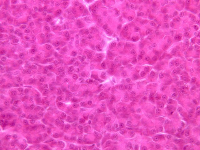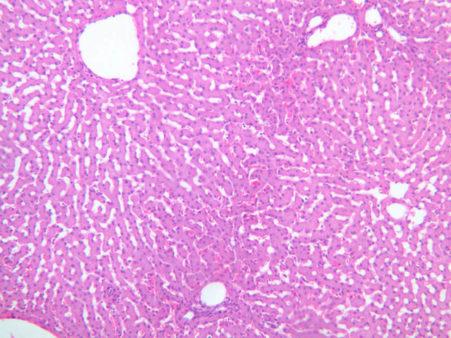 Examine the H&E-stained sections of liver (slides B-29 [10x, 20x, 40x-labeled] [2.5x-labeled, 10x, 20x, 40x] [10x-labeled, 20x, 40x-labeled] and B-30 [2.5x, 10x-labeled, 20x]). At low power, identify the connective tissue capsule (Glisson’s capsule), central veins and portal triads (portal canals). Note that the cells of the liver parenchyma (hepatocytes) appear as cords--more accurately, plates--of cells that radiate out from the central veins and partially enclose blood spaces known as hepatic sinusoids. Note that the plates of hepatocytes appear to branch and fuse and that, as a rule, they are only one or two cells thick. Do you see any binucleate hepatocytes?