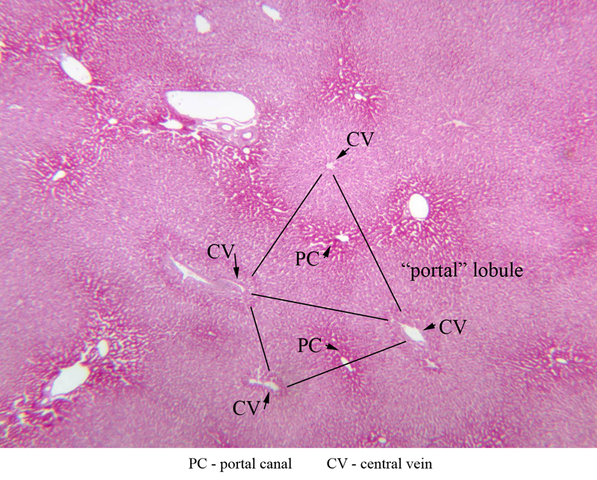 (2) Move the slide so that a portal triad is at the center of the microscopic field, then identify the three central veins that define the boundaries of the portal lobule that surrounds the reference portal triad. Since an interlobular bile duct is at the center of a portal lobule, the portal lobular interpretation emphasizes the exocrine functions of the liver (B-31).