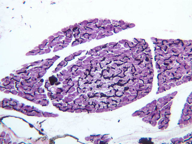 The specimen on slide B-39 was prepared by perfusing India ink into the blood stream of an animal. Examine this specimen with an eye to understanding how the capillary beds of the exocrine and endocrine portions of the pancreas differ (B-39, Ink/H&E [10x, 20x-labeled] [10x] [10x, 20x]).