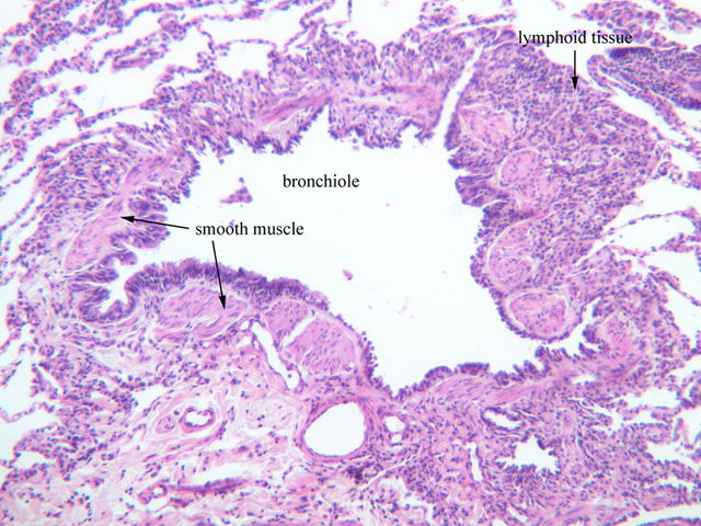 29 Lymphoid Tissue (none) H&E a74 bronchiole 10x labeled.jpgA74, Lung, 10x