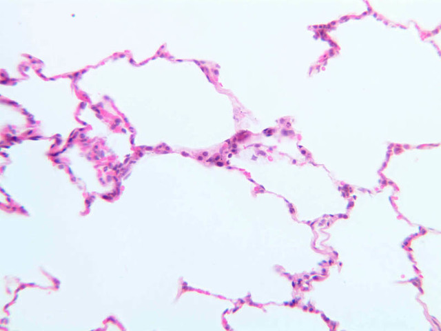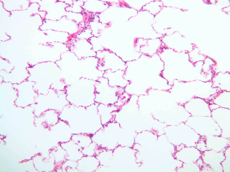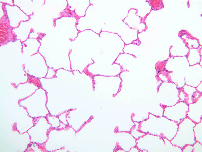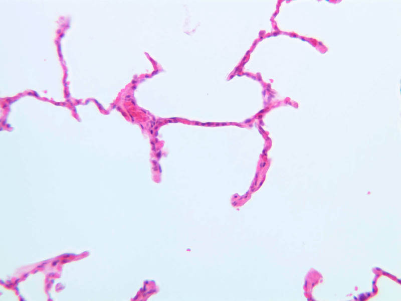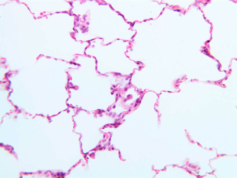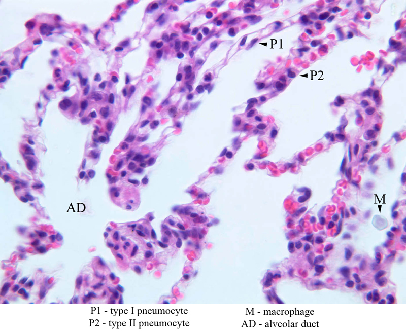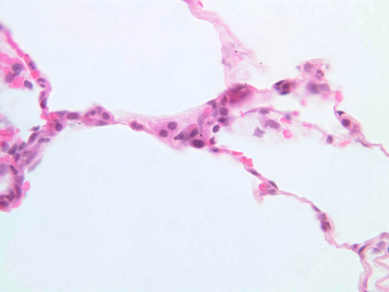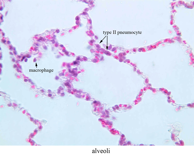 As in other parts of the respiratory system, the epithelium contains two predominant cell types. The type I pneumocyte is a large and highly attenuated cell that covers most of the alveolar surface. The type II pneumocyte (great alveolar cell; granular pneumocyte; septal cell) is a secretory cell that is responsible for producing pulmonary surfactant (A-78 [2.5x, 10x, 20x, 40x] [2.5x, 10x, 20x, 40x-labeled]). The type II cell also functions as a stem cell after injury and divides to form new epithelial cells that differentiate into type I cells and re-establish the epithelial surface. Study the alveolar walls and note that they are filled with capillaries. The capillaries are surrounded by delicate elastic tissue. Though contraction of the major air ducts during expiration is a chief role of elastic tissue in the lung, the presence of elastic fibers in the alveolar walls suggests these are stretched during inspiration and contract during expiration.